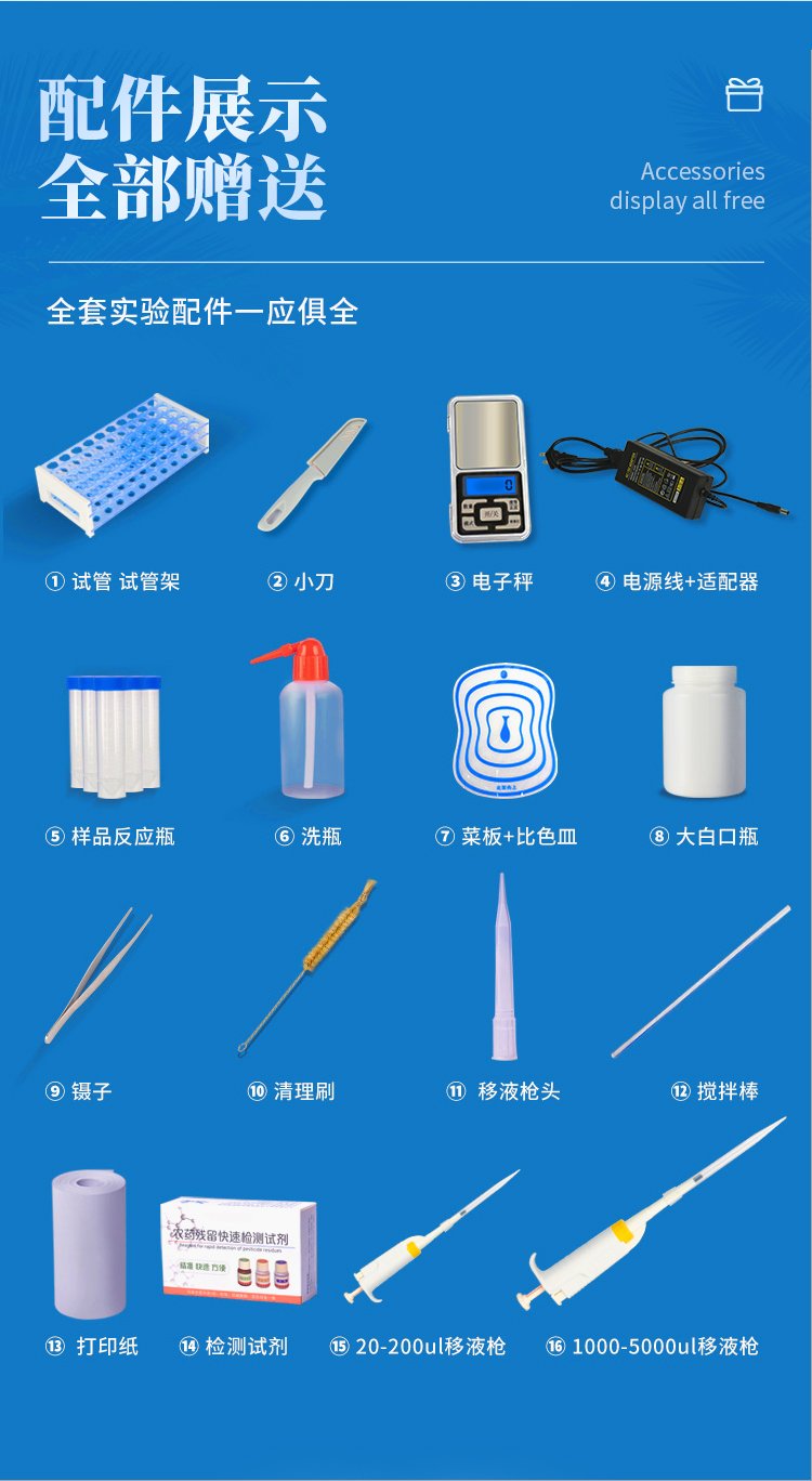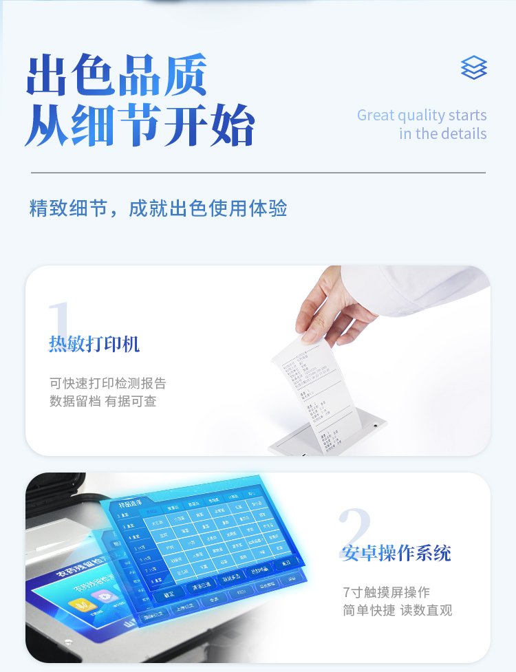 | 安卓智能操作系統,采用更加**和人性化操作,儀器具有無線聯網上傳功能,快速上傳數據,進行數據統計和分析。 | 智能化程度高,儀器具有自檢功能:具有開機自檢和調零功能,具有自動檢測重復性功能;同時,檢測完成可自動打印檢測報告和二維碼。手機掃碼可顯示出詳細檢測信息。 | 儀器帶有監管平臺,數據可局域網和互聯網數據上傳,檢測結果直接傳至食品安全監管平臺。進行區域食品安全監管及大數據分析處理與數據統計,檢測區域食品安全長短期動態,達到食品安全問題預估、預警 。 | 樣品處理簡單省力,整體操作快速、安全、便捷。 | 儀器具有自身保護功能,可設置用戶名及密碼,防止非工作人員操作等。 | 內置強大的數據庫,可在儀器上直接選擇樣品名稱、檢測指標、送檢單位等信息,也可在儀器上直接編輯錄入樣品名稱、檢測指標、送檢單位等信息并保存進樣品數據庫,方便后期操作調取使用。 | 儀器具有重新校準、鎖定、恢復出廠設置功能。 |