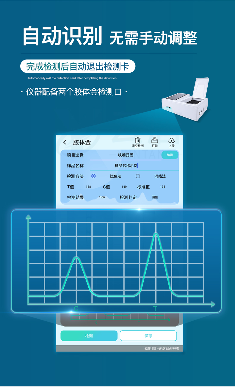 11.5、曲線形式:直插式掃描方式,顯示金標(biāo)卡圖像,實(shí)時(shí)生成、識別CT曲線圖,無需手動調(diào)整,完成檢測后自動退出檢測卡。兼容市場上其他金標(biāo)卡,使用耗材不受限制。