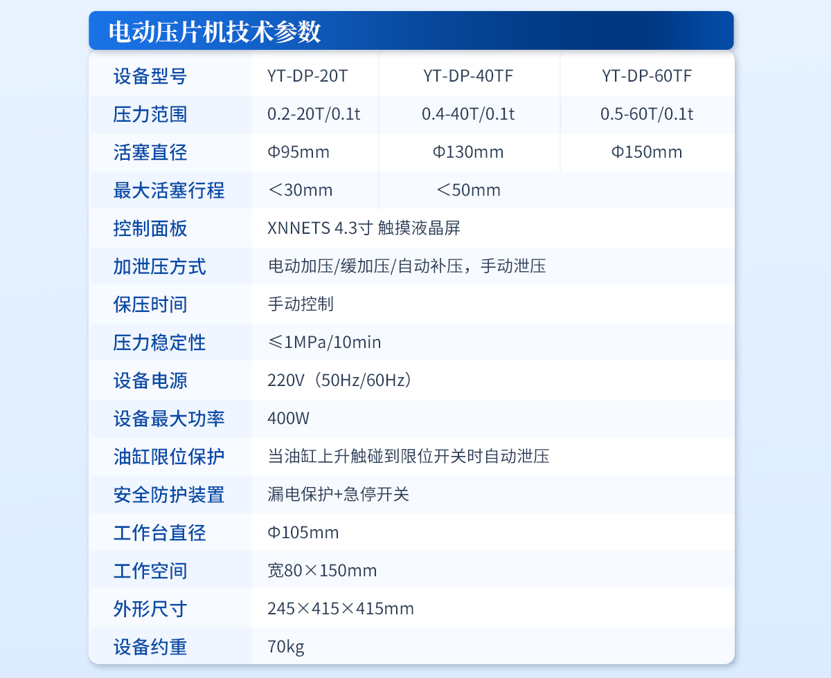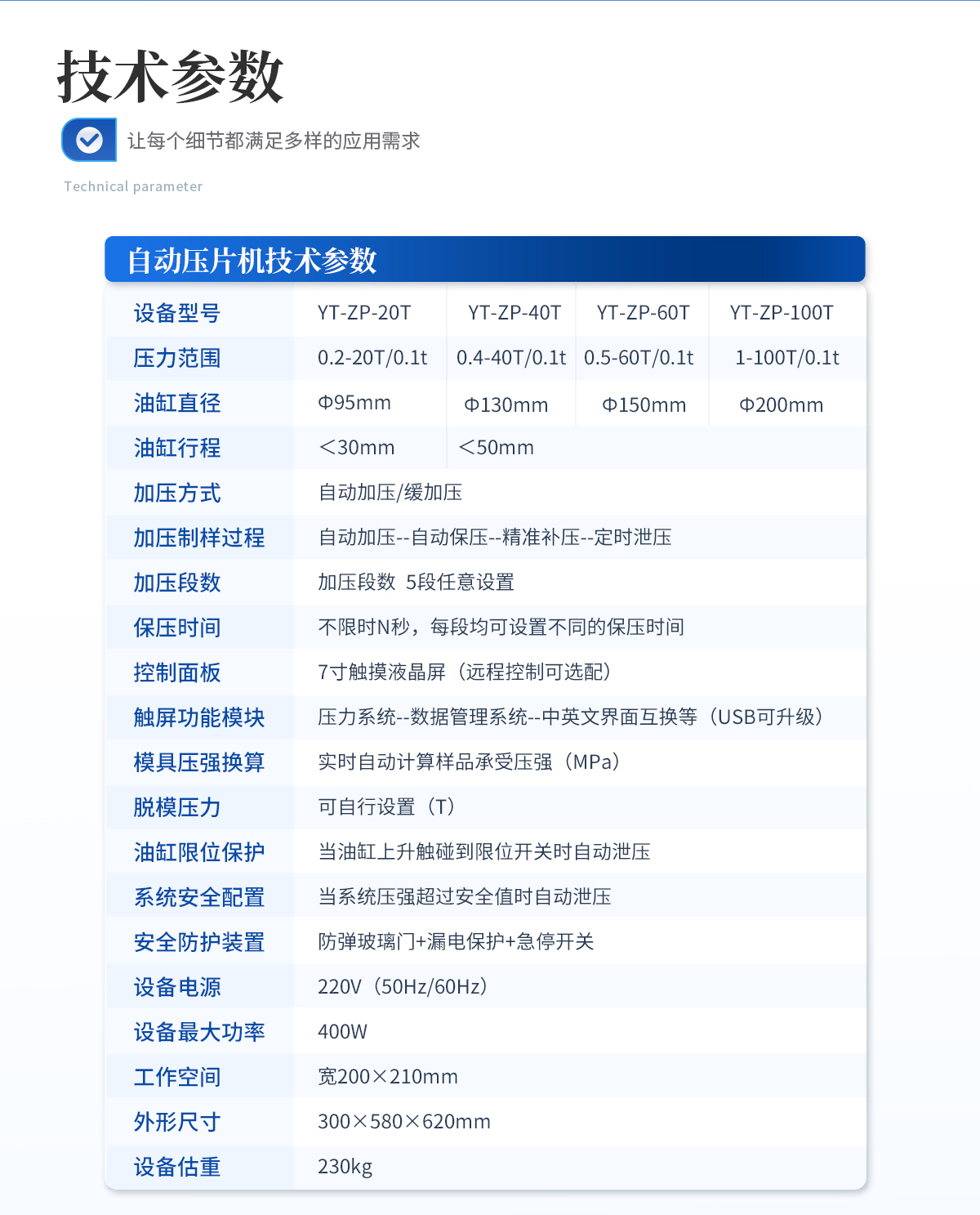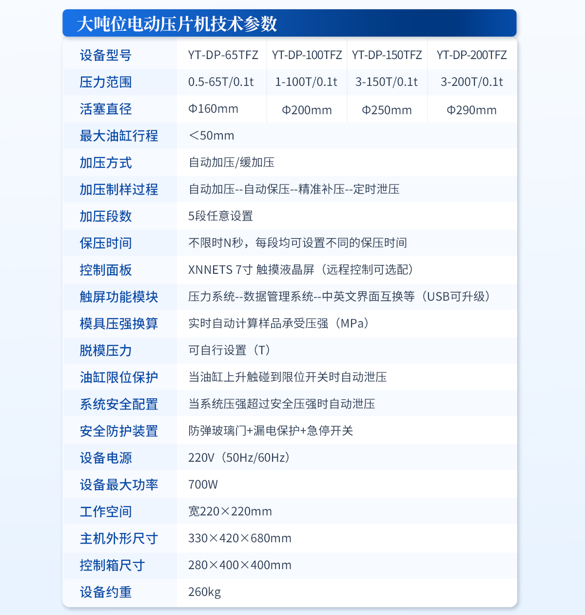 | 設(shè)備型號:YT-ZP-100T | 壓力范圍:1-100T/0.1t | 油缸直徑:Ф200mm | 油缸行程 :<50mm | 加壓方式:自動加壓/緩加壓 | 加壓制樣過程:自動加壓--自動保壓--精準(zhǔn)補(bǔ)壓--定時泄壓 | 加壓段數(shù):5段任意設(shè)置 | 保壓時間:不限時N秒,每段均可設(shè)置不同的保壓時間 | 控制面板:XNNETS 7寸 觸摸液晶屏(遠(yuǎn)程控制可選配) | 觸屏功能模塊:壓力系統(tǒng)--數(shù)據(jù)管理系統(tǒng)--中英文界面互換等(USB可升級) | 模具壓強(qiáng)換算:實(shí)時自動計(jì)算樣品承受壓強(qiáng)(MPa) | 脫模壓力:可自行設(shè)置(T) | 油缸限位保護(hù):當(dāng)油缸上升觸碰到限位開關(guān)時自動泄壓 | 系統(tǒng)安全配置:當(dāng)系統(tǒng)壓強(qiáng)超過安全值時自動泄壓 | 安全防護(hù)裝置:防彈玻璃門+漏電保護(hù)+急停開關(guān) | 設(shè)備電源:220V(50Hz/60Hz) | 設(shè)備**功率:400W | 工作空間: 寬200×210mm | 外形尺寸 :300×580×620mm | 設(shè)備估重 :230kg | 配置說明:壓片機(jī)1臺,模具選配!可根據(jù)需求定制壓片機(jī)或模具 |